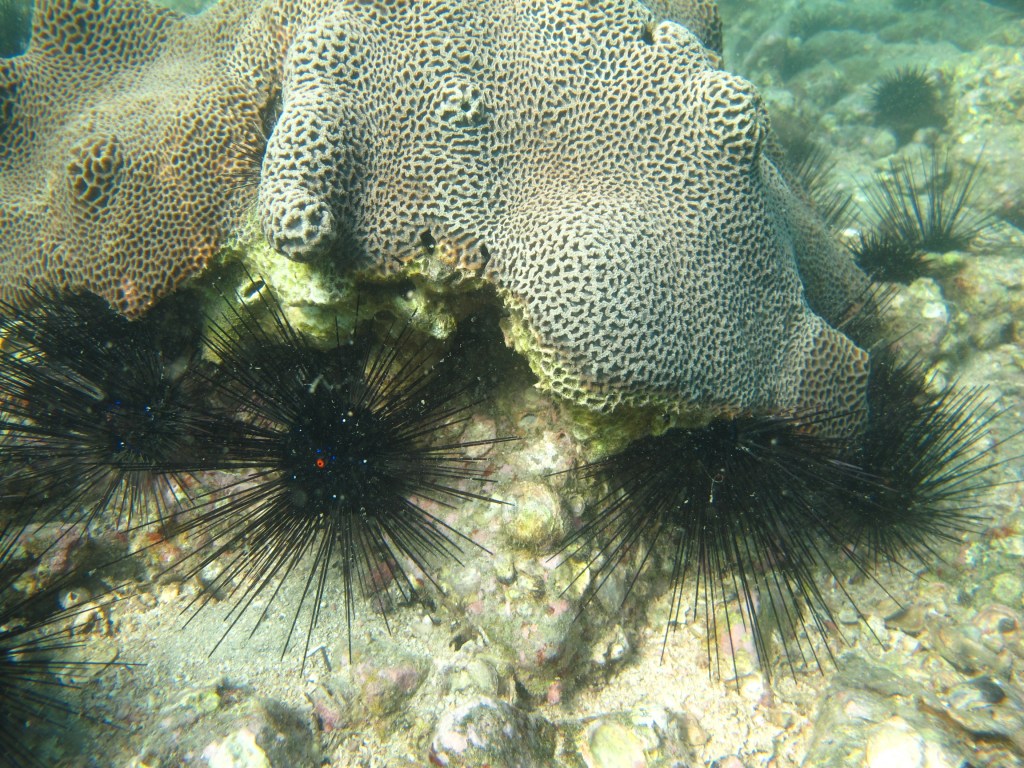 Since 2000, corals in northeastern and eastern waters of Hong Kong have been found suffering from bioerosion due to the outbreak of the long-spined sea urchin Diadema setosum. This sea urchin erodes the coral colonies from their base, breaking the colonies into fragments and engulfing the surface living structure of the corals.